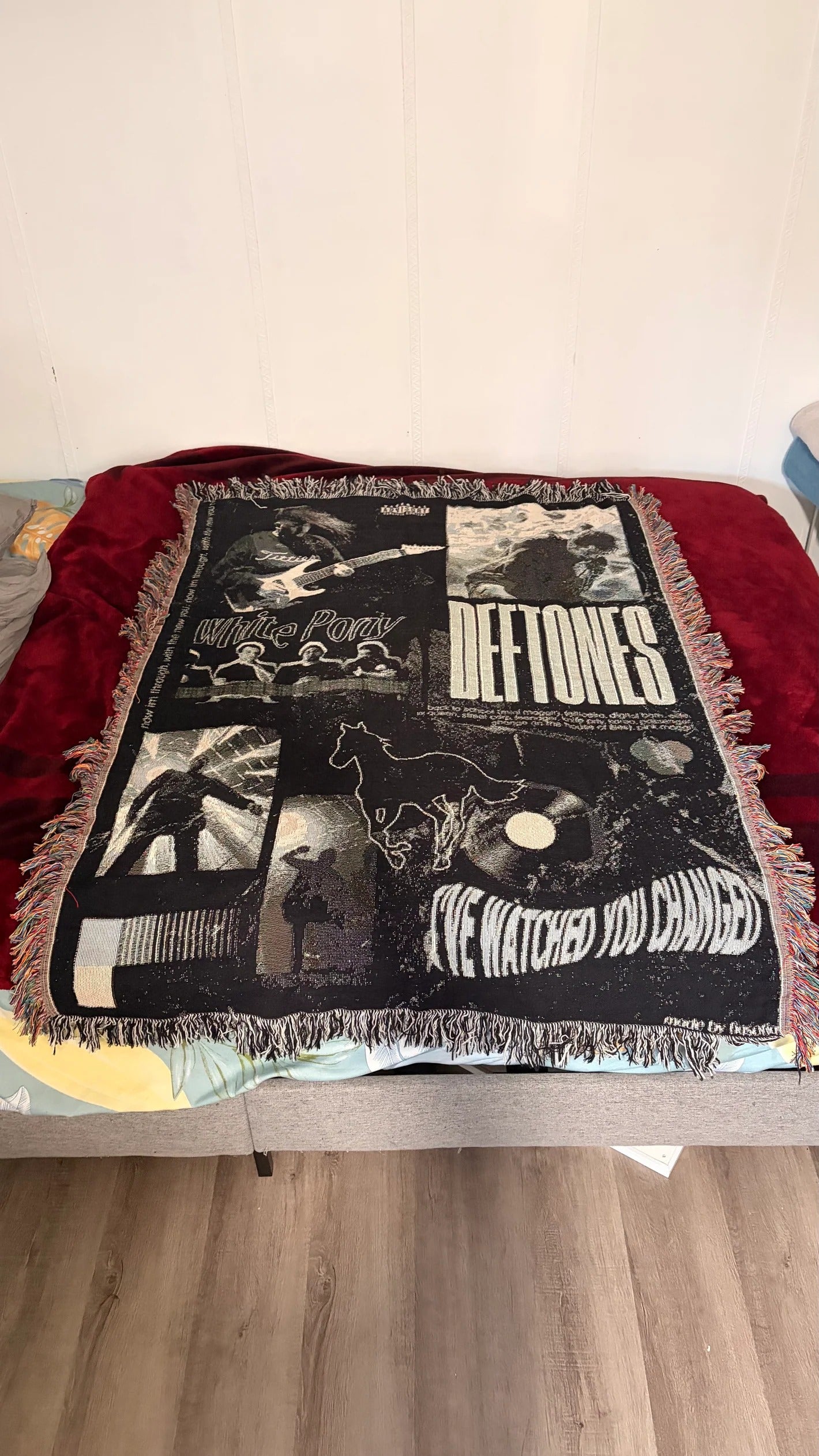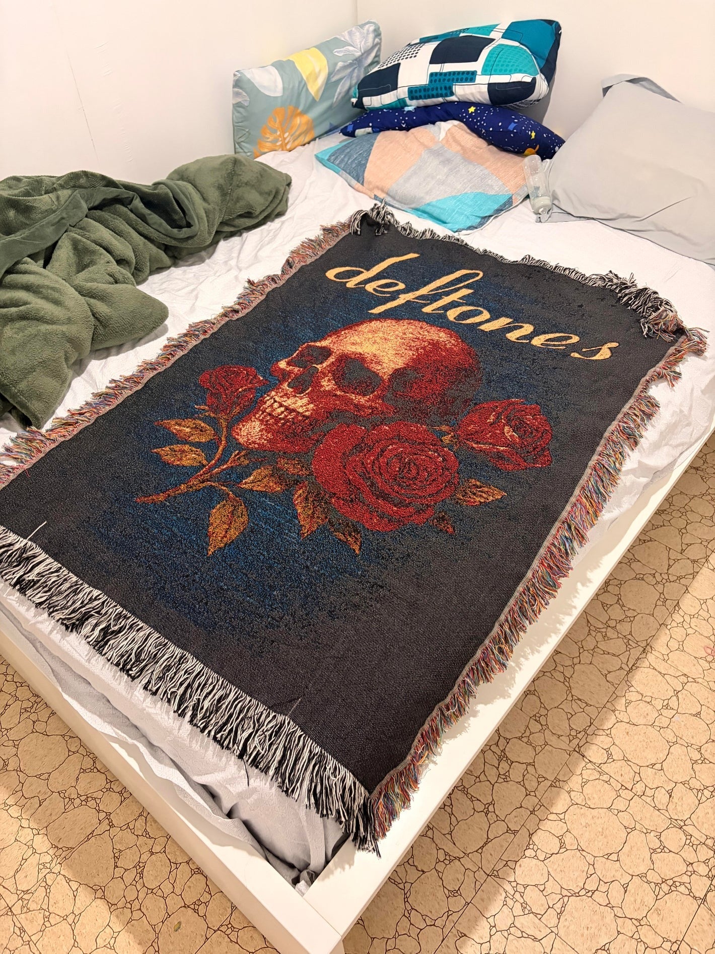 The Deftones Blanket is available in two sizes — 80"x60" for full bed or couch coverage, and 52"x37" for a smaller option. Both are perfect for everyday comfort or decorative use.